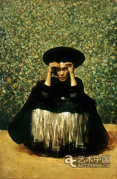 龐茂琨的古典畫風的創造來自南方,和北方的古典畫風遙相呼應。正是在80年代下半期,北京中央美術學院油畫系靳尚誼教授主持的工作室,也推出一批堅持古典畫風的青年畫家。其中最具有代表性的是楊飛云。不同于楊飛云的是,龐茂琨的畫風更見哲學意味,有一種哀愁情緒。所謂更具哲學意味,是說龐茂琨的作品形而上的味道濃,主觀的東西多。假如說楊飛云側重于用古典技巧描繪客觀物像的美,那么龐茂琨則力圖在主客體的結合中,強調某種理念。1989—1990年,他創作了一組人物畫,如《大地》、《行云》、《大黃傘》、《小溪》、《月光》、《蘋果樹下》、《靜靜的小院》、《祥云》等。除《靜靜的小院》雙人外,其他都是描繪單個人物的,在這些一幅幅的人物面前,我們看到的處于安寧、肅穆狀態下的人物和環境,但是,體驗到的都是一種難以言狀的憂愁和哀傷。這些遠離現代文明的彝族男女,有著獨特的生活方式,獨特的美,有著自己的尊嚴和內心世界,但是他們遠離著“現代文明”。他(她)們為之迷戀,也是使畫家為之迷戀的那種詩一般的、有些神秘意味環境和氣氛,其實是一種烏托邦的理想境界。繁鬧的世界讓我們在欣賞龐茂琨的畫幅時得到某種精神慰藉,然而那只是暫時的滿足。然而,我們發現,那只是夢幻的存在。其實,何止是彝族的生活方式,即使是充滿著生命活力的這些男男女女,還有我們每個人,何嘗不是在宇宙中極為短暫的“現象”和“存在”?這是這些男女人物的哀愁,還是畫家出自于形而上思考的一種內心情緒?如果用龐茂琨自己的話來解釋畫家“內心的真實與客觀的真實是同一種真實”,那么,我們深深體驗到這位既對西洋古典文明如醉如癡,又對中國古代老莊哲學深感興趣的年輕畫家,在這復雜多變的中國大文化環境中的深層思考。