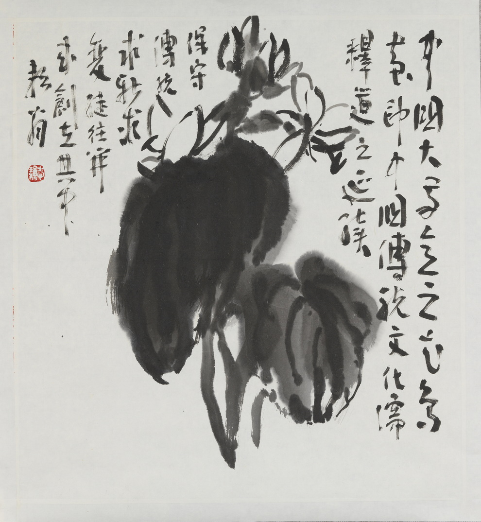 釋文:中國大寫意花鳥畫即中國傳統文化 儒 釋 道之延續 保守傳統 求新求變 繼往開來 創立其中 耘翁