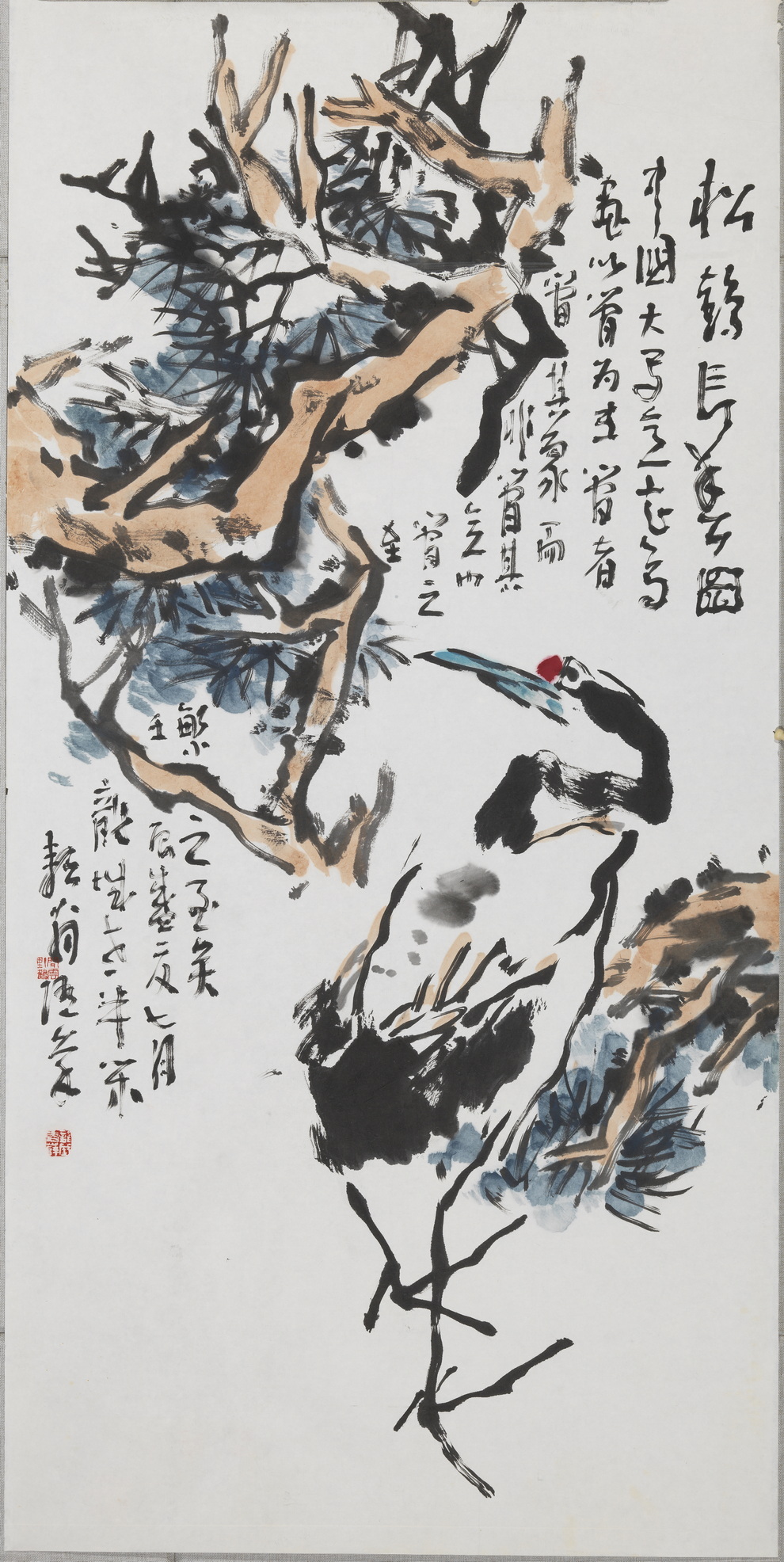 釋文:松鶴長春圖 中國大寫意花鳥畫以簡為上 簡者簡其象而非簡其意也 簡之至繁之至矣