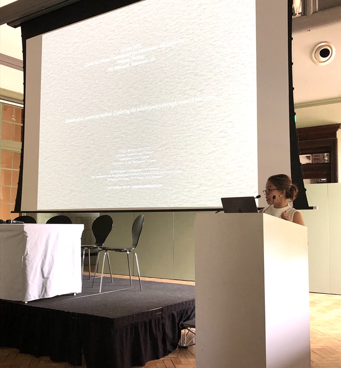 會議下午的發言由CFCCA的資深策展人瑪麗安娜·松琪(Marianna Tsionki)主持,三位發言人康喆明(Cosmin Costinas)、瞿暢和泰薩·瑪利亞·格松(Tessa Maria Guazon)是來自香港和菲律賓的機構策展人。聽到下午場的時候我特意看了一下會議的英文標題“Transcultural Research and Curatorial Practice in China’s Contemporary Art”里用的是“China’s”而不是“Chinese”。CFCCA一直則以“華人”“華語”來理解“Chinese Contemporary Art”,一方面是因為CFCCA在創始時和華人移民社群的淵源,另一方面或許也與它試圖與新加坡等更多地區的藝術發生關聯有關,畢竟對于CFCCA,它的基礎支持系統來源于英國的公共藝術資金,需要與更多的受眾產生連結。在下午場,講座的重心似乎從上午的“China”分散到時而為跨文化(transcultural),時而為研究(research),時而為策展實踐(curatorial practice)。