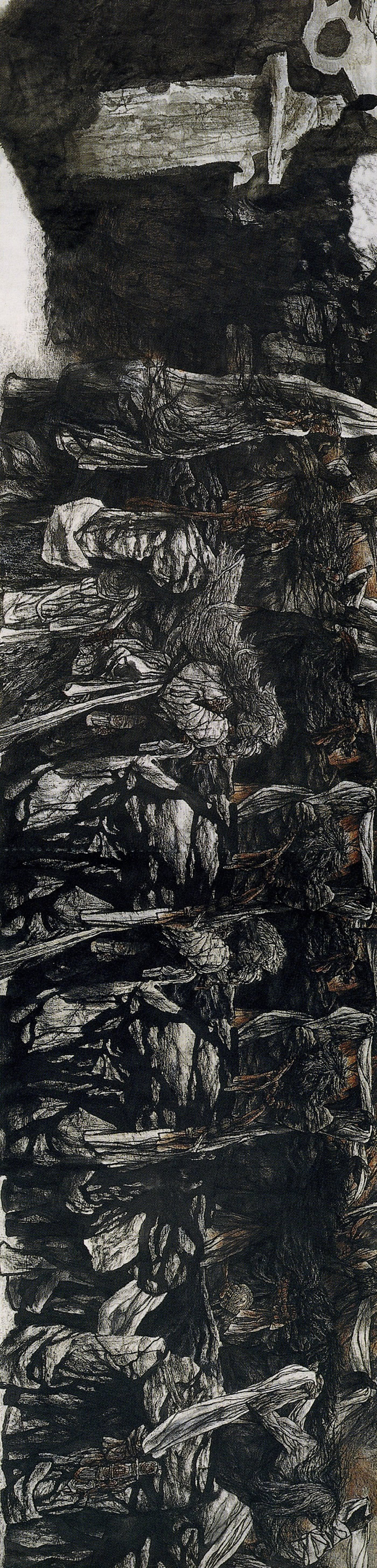 德國哲學家哈貝馬斯指出:“人的現代觀隨著信念的不同而發生了變化。此信念由科學促成,它相信知識無限進步、社會和改良無限發展?!薄读髅駡D》對現實主義方法運用得非常純熟,并在當時其藝術水準“獨在眾人之上”?,F實主義在西方美術史和中國美術史上都占據著極為重要的位置。透視法,作為現實主義重要的方法,在藝術史上具有極其重要的意義。它代表了科學、理性、反思和批判的精神。蔣兆和先生的《流民圖》將透視法、寫實的造型和傳統水墨的表現形式最好地結合在了一起。20世紀下半期,隨著西方現代主義和后現代主義各種藝術思潮涌入國內,國內的藝術也呈現出更加多元化的格局。李伯安先生在《走出巴顏喀拉》中對現實主義、表現主義、浪漫主義、超現實主義、抽象藝術等諸多現代主義的藝術風格皆有所借鑒和表現,并將其與傳統水墨的大寫意風格和傳統線描風格進行了融合,呈現出一種開放性的藝術語言體系,具有更為開闊的視野(我在另一篇文章《開放性的視野——<走出巴顏喀拉>對現實主義、浪漫主義、表現主義、抽象藝術、超現實主義和傳統線描的借鑒》有更為詳細的介紹)。
