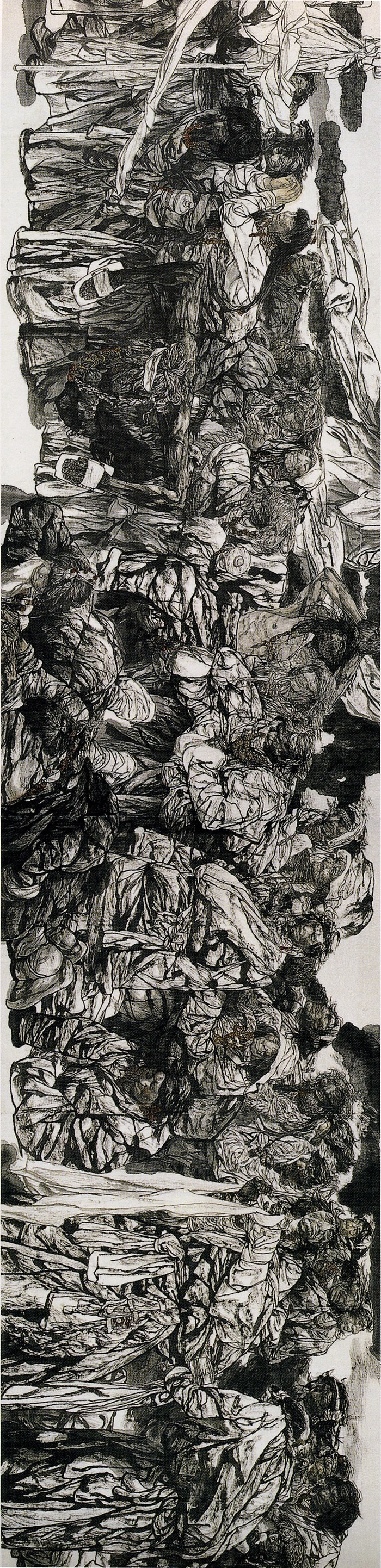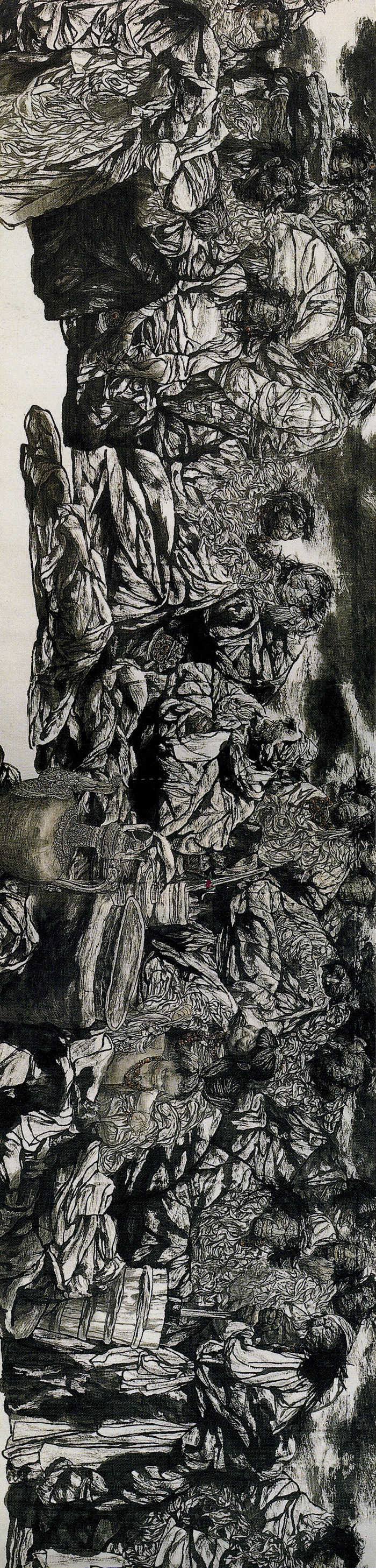 李伯安先生的水墨人物長卷《走出巴顏喀拉》是20世紀下半期另一幅重要的水墨史詩性作品,它高1.88米,總長120余米,描繪了日常生活中266個極其普通的藏民人物的生存狀態。畫面通過敘事性的描述,表現手法上融會貫通了西方現代主義各種藝術風格,給予日常生活中普通人生命的生生不息以史詩般的描述。正像中央美術學院院長范迪安先生所說,“他畫得雖然是藏民的生活現實,但在作品中寄寓的是對整個中華民族歷史命運的深切關懷,表現的是中國人抗爭、希望、奮斗的生命力量”。