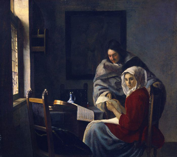 維米爾作為“荷蘭小畫派”流派的代表人物,在他的畫作里反復描繪了中產階級家庭生活?!捌奋薄白鳟嫛薄白x信”“梳妝”“談情”“弄樂”“做學問/研究”等等都是他習慣使用的場景元素。例如中提琴維奧拉 (Viola) 就出現了四次。但在他晚期畫作里,反復出現了兩次彈奏鋼琴的場景,但演奏的女子表情忸怩不安,與早期他溫柔撫琴女子形成了鮮明對比,這也從另一個側面反映出維米爾生活境遇的改變。