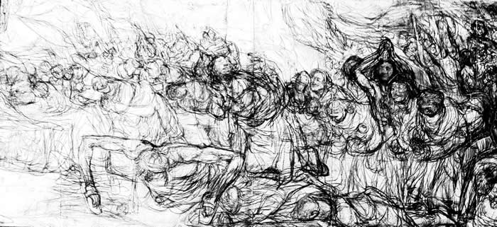 藝術創作的許許多多的所謂的風格,所謂的表現形式,其實都不一定是藝術家之前可以預想的東西,許多作品都是在創作中不斷摸索探索中尋找到的與表現內容、主題思想相契合的那種形式,包括獨特的藝術語言。李伯安的這件作品就是這樣一種完美統一。從李伯安作品最初的一些創作草圖中,我們能看到他其實在整個創作過程中,還是受到了許許多多的油畫的繪制方式的影響,比方說他注重整體的組合的明暗與冷暖的調子對比,強調黑白灰的關系,人物組合的分量,及畫面厚重感、空間感等等。他在大量運用黑和線的同時,非常注意紅色或黃色的對比,而且紅色會有許多細微的變化,巧妙而自然。