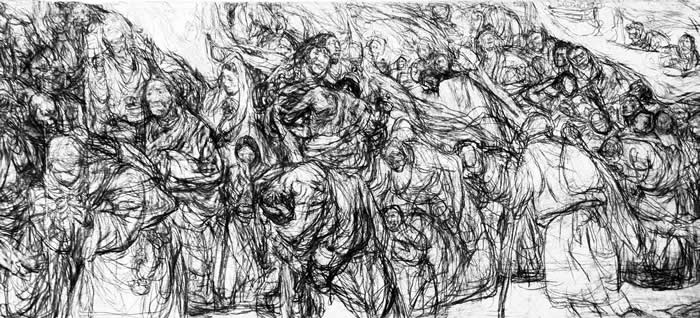 從整體上看,李伯安的這幅長卷《走出巴顏喀拉》,在畫面背后有著一種對文化和歷史的沉思,對當今時代步伐和脈絡的一種準確理解和認知。在他的筆下眾多人物的眼神中,有著一種急迫的渴望,一種不斷向前的沖動,這就是李伯安他理解的和看到的。那是如同用窺視鏡探到的內心世界,對內心世界的一種挖掘,也是用心底發出的感應感受到的對方低喘的呼吸與心跳。畫面中表現的這些人物,不僅表現出了那樣一個人群所特有的神情,更主要是通過神挖掘表現到了這些人物的心靈,心靈的活動和心靈內在的涌動與期盼。作品里面的一些人物,眼神會勾人心魄,會射到你的心靈的深處,會觸動你的神經最深處那點東西,會撥動你的心弦,發出最沉悶的聲響。