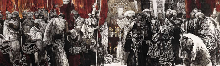 在李伯安的作品中,他非常注重視覺的焦點,往往會在畫面上以若干形象或道具去襯托突顯某一個形象。在整個長卷中,這部分畫面人物塑造的相對更為理性,在色彩方面也相對的比較豐富,裝飾意味較為濃郁。但是,不管是古今中外,在李伯安的手下,各種風格特點手法都完全融入到了他自己的筆下,最終變成他自己所需要表現的一些東西,包括裝飾性極其裝飾帶來的形式美和視覺美感。