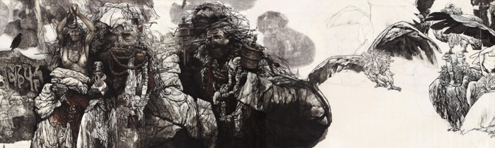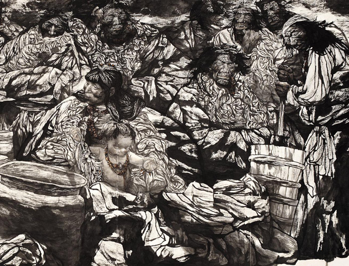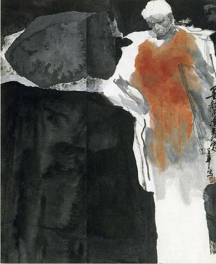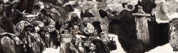 中國文化在漢唐之后,沉靜淡雅多于奔放雄勁,藝術的程式化多于藝術的原創性?!蹲叱霭皖伩吩诶L畫方面對中西的技藝融合,提升了中國畫的層次感和厚重感。在伯安老師的筆下,由黃庭堅和懷素融匯而成的行草線條,蒼黃遒勁,穿插于法國浪漫主義繪畫、俄羅斯巡回畫派與德國表現主義藝術之間,大刀闊斧,酣暢淋漓。畫中展現的即是一種與20世紀初德國女畫家珂勒惠支版畫,在精神和情感上的契合,雖然陰郁沉悶,但卻氣息逼人,充滿了堅韌和熱忱,也更是心中意氣如同火山迸發般能量的抒發與釋放。