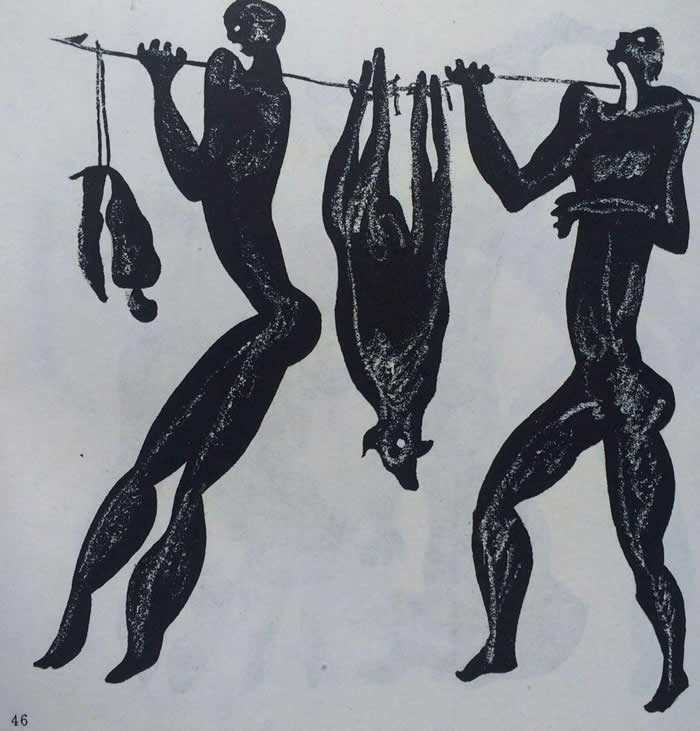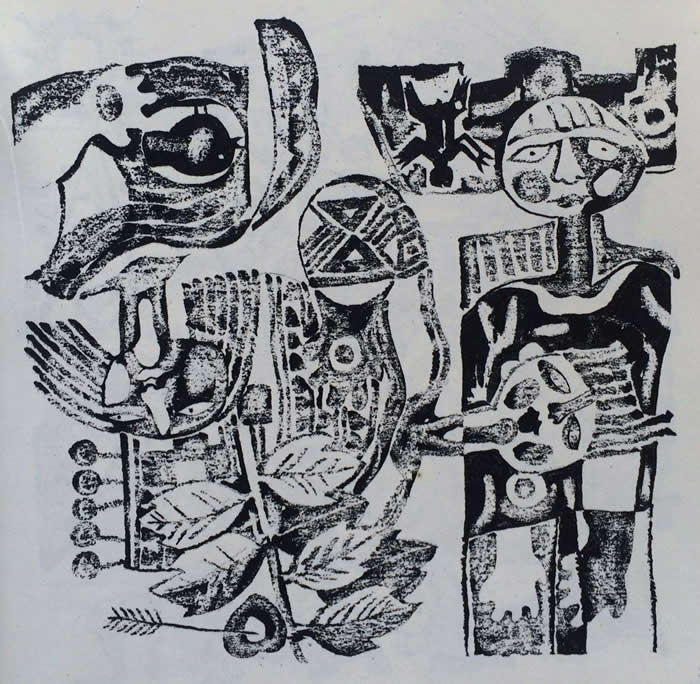 這一部分畫面的處理,更接近于一種抽象形體的組合與拼貼藝術的塊面組合。 另外就是像的畫面大的黑白塊兒的處理,能看出對柯勒惠支鍵黑白版畫畫面處理的那種整體的那種效果,當然,還有很多其他的方面的東西,能看到李伯安的知識面和藝術修養的廣泛性。