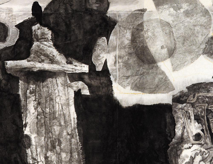 藝術創作從開始無法到逐漸去尋法,按照法一步一步的去實現,而到了一定的層面和高度,又會從有法變成無法。這個無法到有法再到無法看上去是個輪回,但前后不同,是一個從初級到高級的一種變化,而這種變化最終的無法是一種超越性與升華,這種超越不僅是對藝術家自我,也是對前人的一些法的理解和深刻認知后,對新的一種法的一種制定,這種制定只有藝術家自己能夠首先去在實踐中實現,只有他自己首先在實踐中去把這種法去確定下來,后人才能去借鑒,去學習。李伯安的這幅長卷就是這樣,前面所有的只是他對古今中外藝術的借鑒學習,但這幅畫兒形成并締造出了屬于他個人的法。