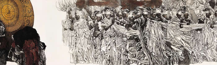 李伯安將他的人生經歷與認知,和對人生、對民族感悟,運用到了他的作品中?!蹲叱霭皖伩死贩从车氖且粋€民族的覺醒,崛起和奮進??梢哉f,藝術創作的獨特性與獨創性也正源于此。不是刻意地去追求風格個性,而是在主題和內容驅使下自然水到渠成。