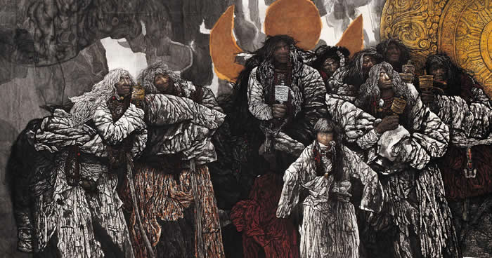 最初日本企業家西部基夫先生,他是希望能在中國尋找兩位畫家,一位畫長江,一位畫黃河。那在這樣一個基本的想法下,他來中國尋找,很偶然的在四川美術學院展廳看到了李伯安的畫,并通過相關的老師聯系到了李伯安,應該說有了這樣一個契機,促動了李伯安開始去創作有關黃河題材的這樣一件作品。這就是我們常說的機遇,但機遇總是給那些有準備的人留著的。正因如此,促發了李伯安創作的動機,開始對藏族的宗教活動和世俗生活,以及他們的形象開始全方位的進行研究和揭示。為此作品的創作他三次上高原采風寫生,收集素材。