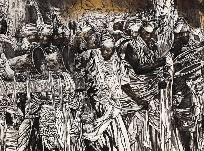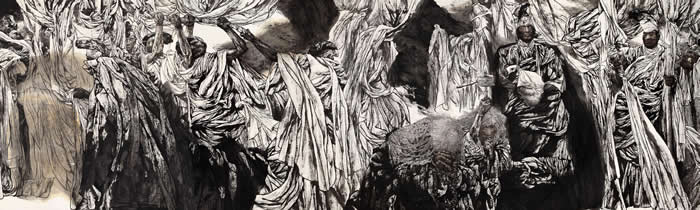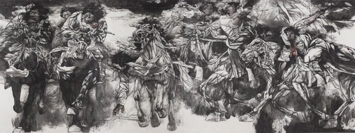 為了更好地反映人們的一種整體的崛起奮進,或者說,從某種角度上為了更好地展現人物的神情身姿,沒有選擇遠景,而是選擇了一些近景,通過接近1:1的比例,直接把形象展現在人們面前。通過這樣一種大手筆,大畫面,大圖像的展示,營造出了一種鋪天蓋地,撲面而來的畫面氣勢,波瀾壯闊,排山倒海,勢不可擋。這種選擇應該說是從藝術創作上,尤其是水墨寫意人物繪畫方式上看是非常艱難的,是非常具有冒險性的。因為眾多的人物有一筆敗筆,整個畫面都會失敗。怎么能夠在一個這么大的畫面中保持的一種精神氣質的連貫,這對一個畫家來說是一個重大的挑戰。