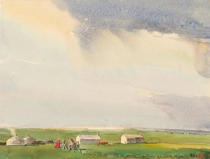 蕭淑芳和古元這兩幅作品作于同年,是一起去內蒙寫生而作,表現的景物也基本相同:氈房、牛羊、農具,甚至婦女服飾都是喜慶紅色,一派祥和的草原生活畫卷。前者作品天空和草地五五分割,畫面柔和溫婉;后者則俯視草原,利用水彩的優勢,將大面積的天空色彩變幻表現得淋漓盡致,也讓觀者心曠神怡。