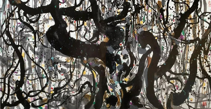 樹是吳冠中最喜愛的題材之一。90年代后吳冠中少作油畫,水墨化為行而上的表達。在《榕樹》中,他用簡練而粗重的黑色線條表現榕樹虬曲厚重的樹干,在背景中表現氣根的灰色細線條更襯得榕樹強勁有力。整個畫面疏密有致,真正做到從繁蕪的現實表面抽離出本質的美,西雙版納的老榕樹所散發出來的旺盛生命力,恰如作者古稀之年仍煥發出強勁的藝術創造力。