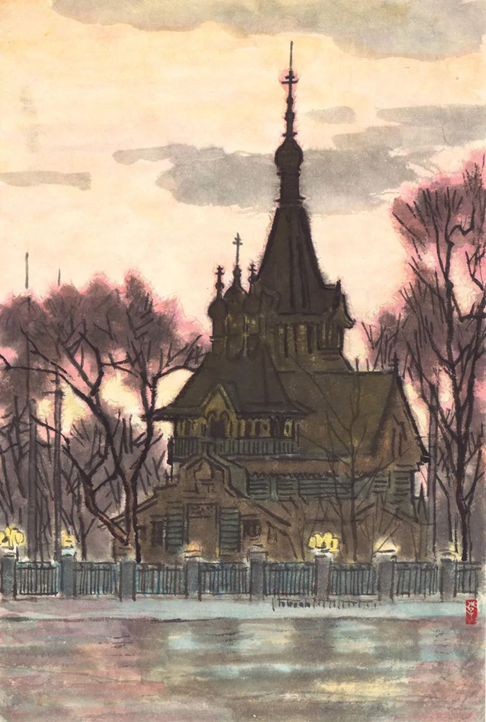 李斛,圣尼古拉教堂,紙本彩墨,41×28cm, 1962年