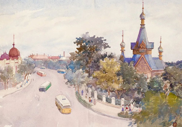 哈爾濱是一座充滿異域風情的東北城市。具有標志性的圣·尼古拉教堂是在俄國沙皇尼古拉二世支持下,于1900年在哈爾濱紅博廣場建成的。1966年8月,因“破四舊”被紅衛兵拆除。2006年復建,命名為“尼古拉藝術館”。顯然蕭淑芳和李斛畫的是原建的尼古拉教堂。