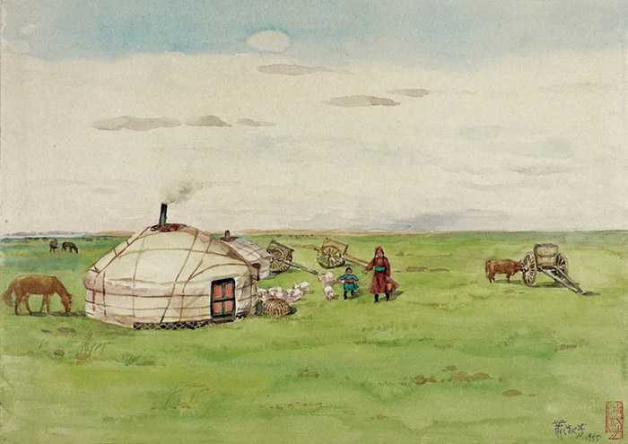 蕭淑芳,草原小家,紙本水彩,25×38cm,1955年