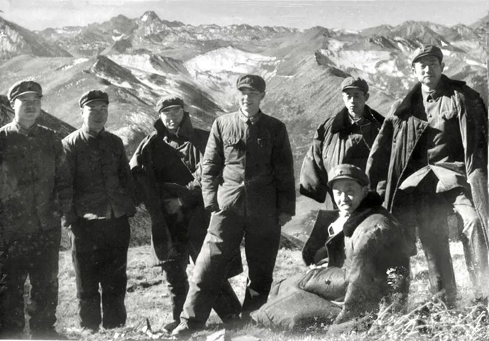 1975年,長征路上寫生團翻越黑水縣境內的留影。前坐者張文源,左三艾軒,右一何孔德(黃道明攝)