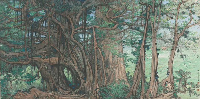 云南風景是宗其香西南區域除桂林之外表現最多的題材。這里山清水秀,溝壑叢林,民風淳樸,民族特色。最引人的還是大榕樹。宗其香用寫實的手法,將盤根錯節、粗壯繁茂的大榕樹細致表現。透過樹干遠看,是廣闊的稻田,是富饒的土地,也是安居樂業的象征。
