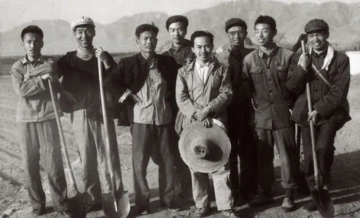 1970年,吳冠中下放農村勞動期間,與同事、學生攝于李村