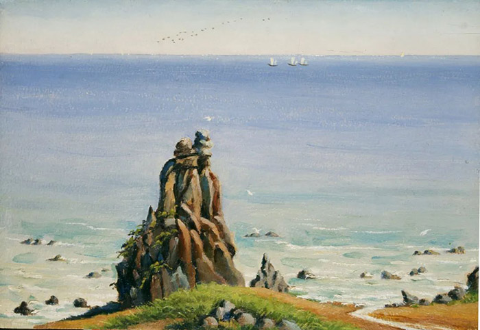 許幸之作品中,主體鷹角石迎著朝陽,水面平靜無波,遠處白帆點點,再遠去鴿子群飛,一幅愜意祥和的畫面。宗其香作品中,巨石屹立,微波蕩漾,船只往來,游人散布。李瑞年則摒棄了一切事物,畫面純粹,海天相連,鴿子窩靜默著,屹立千年。