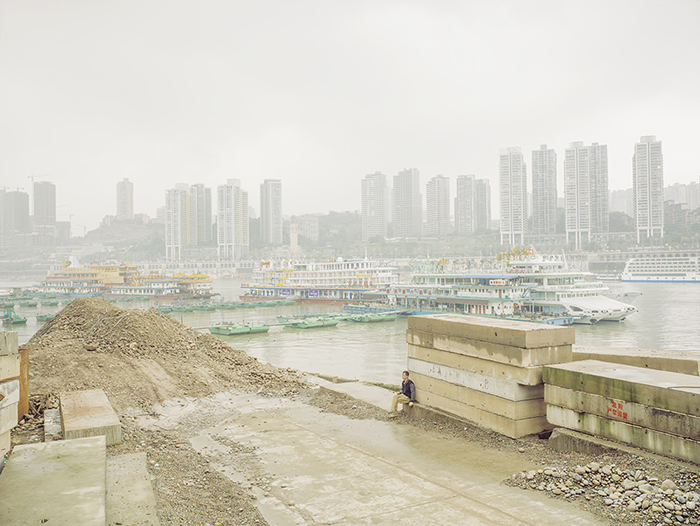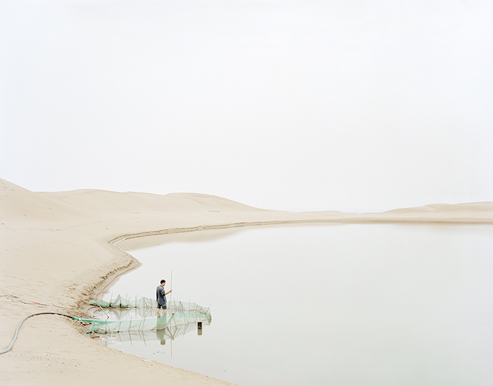 張克純的鏡頭保持著遠觀的距離,畫面中的人如螻蟻般微小,反襯出自然與人造景觀的巨大的體量空間,延伸了深遠的意境,這如同傳統山水畫中的設定。但他們的姿態更值得回味,他們保持靜默,佇立、端坐著凝望遠方,張克純在后期甚至將自己置身拍攝場景中,這些似乎象征著人在一個大環境和社會洪流中作為個體的存在,既微不足道又無力掙脫,不喜不怨、孤獨自洽仿佛是這個時代人精神的寫照。