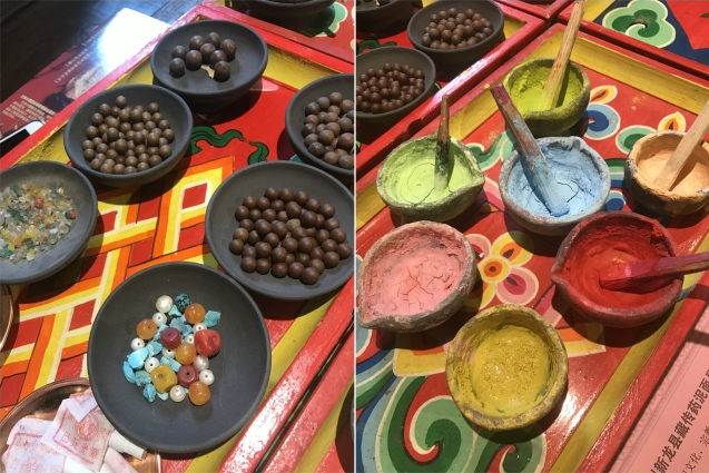 據《迷旁?智者入門》記載:制作藥泥必須采用海拔4600米以上神山的泥土和水,參合的所有材料也都是貴貨。舍利、甘露丸等宗教圣物80余種、珍珠七十丸等名貴藏藥60余種、紅景天等中草藥60余種、珊瑚、珍珠、瑪瑙、寶石等80余種、草果等香藥25種,最后上色原料也都是礦物質。