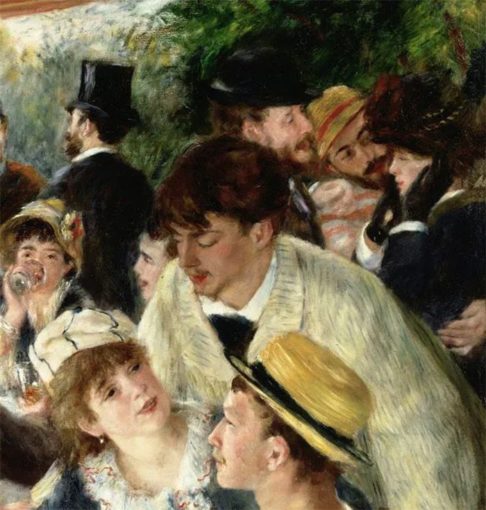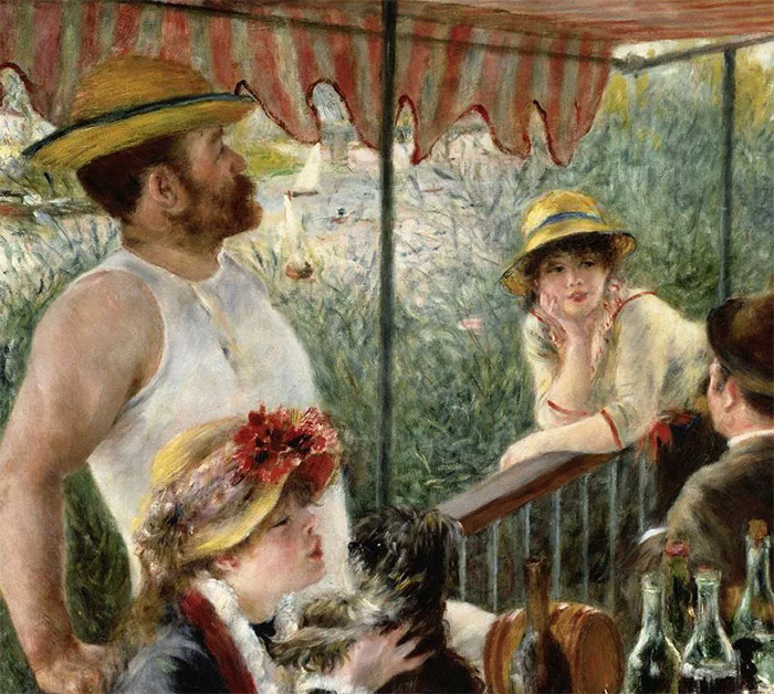 雷諾阿經常以他的朋友和熟人為原型作畫,在這幅畫中沒有明確的主體,我們幾乎看不出他們誰是主角,誰是配角,畫中人就像大合唱一樣,構成了一種整體美。畫面左下角畫家畫了自己未來的妻子亞琳·夏莉歌,她正對著一只哈巴狗輕聲說話,在欄桿旁手托下巴的女子是餐館老板的女兒,還有印象派畫家古斯塔夫·卡耶博特,他正兩腿張開反坐在椅子上。后方的畫面中有一個似乎正在沐浴的女子,前方與后方的畫面處于兩個不同的空間之中。