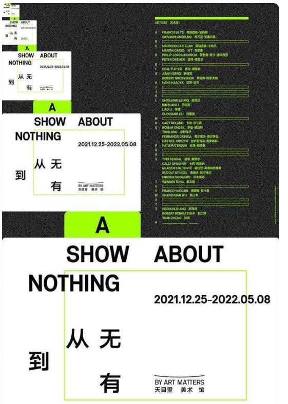 開館展覽“從無到有”(A Show About Nothing)匯集了包括弗朗西斯·埃利斯、莫瑞吉奧·卡特蘭、耿建翌、羅伯特·格羅夫納、漢斯·哈克、梁芝蘭、李燎、劉國強、卡迪·諾蘭德、小野洋子、提諾·賽格爾、杉本博司等三十余位國內外知名藝術家的經典作品與根據空間特性創作的委任作品,探討當代中外藝術家們如何處理“無”這一概念。