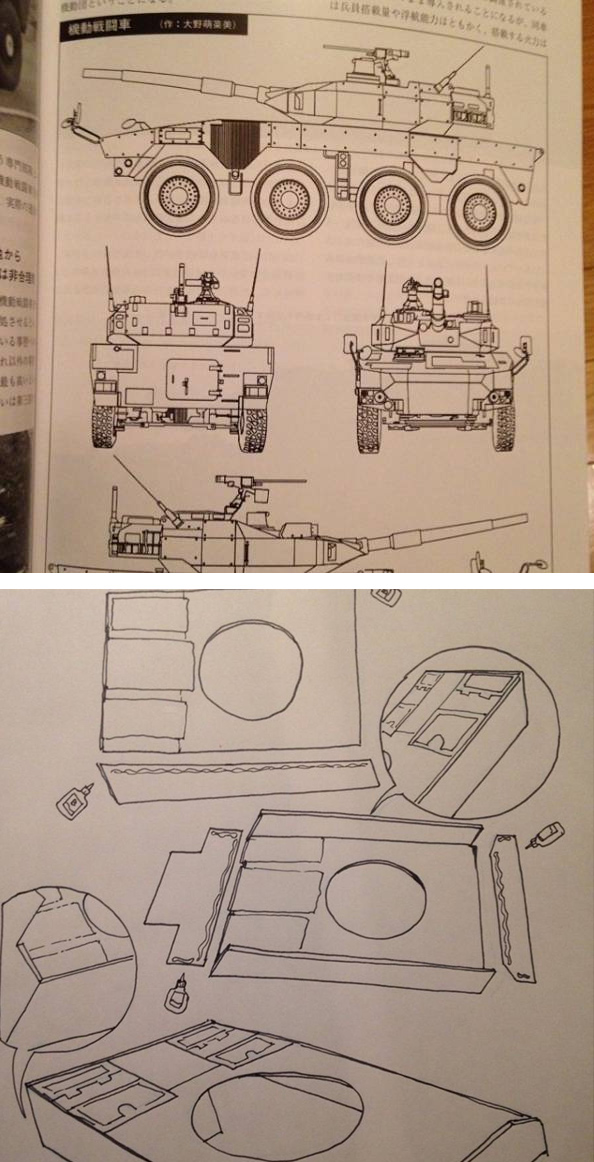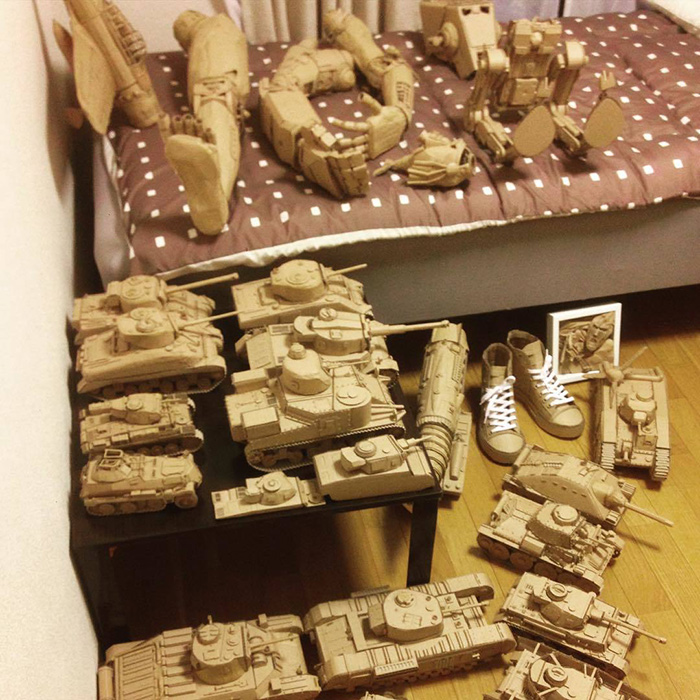 Monomi Ohno還是一位軍迷,喜歡做各種武器,小到左輪手槍和突擊步槍,大到裝甲車坦克應有盡有。有時為了完美展現一輛坦克,她會花費大量時間查閱相關資料和圖冊,然后自己畫出線稿,每一個部件和細節都要提前設定好再去制作。