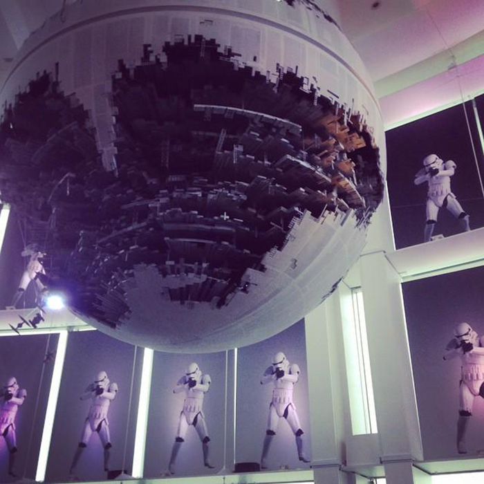 《星球大戰》里巨大的千年隼,還有從起降機里走出來的人物,還有R2-D2機器人。