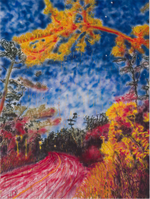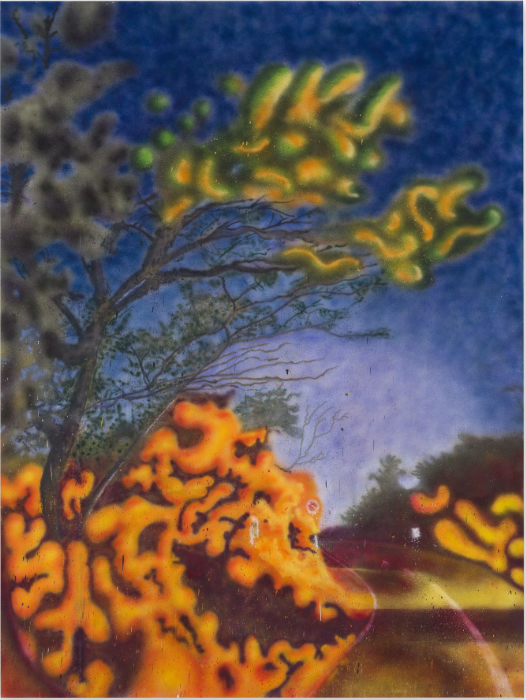 這批風景是今年春天,他和妻子開車旅行到日本石川縣他妻子家鄉地區,他們在一個荒蕪的海灘上進行了一場令他難忘的夜游。在這片荒地上,樹上的積雪還沒有融化,在凄冷的月光和汽車燈光下閃爍著奇異的畫面。這幕場景在他腦海中揮之不去,最終藝術家在最新的作品中,采用了一套不同的噴漆技術。他在堅實的形式上采用多層渲染微妙的配色方案描繪了一系列樹木、荊棘和荒草的風景:在深藍的夜空下,前方路面逐漸消隱在朦朧的地平線上,路邊樹木和荒草的枝杈就像珊瑚的觸手一樣向夜空蔓延,強烈的紅色、黃色和白色透射出艷俗、驚悸和孤絕的超現實感。