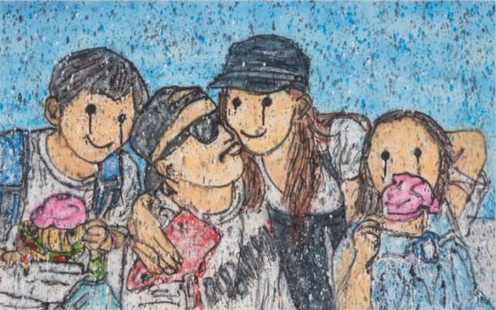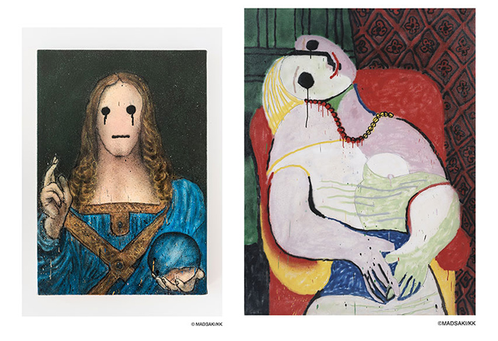 但如果僅僅把MADSAKI的藝術看做效仿波普、涂鴉對經典的顛覆,又似乎簡單了些,在MADSAKI的藝術實踐中我們在更深層面能發現他試圖用笑聲和幽默來分散和治療他內心的混亂。他作品最顯著的標志就是畫面人物幾乎都有一張卡通式的笑臉和流淌著黑色眼淚的眼睛,這讓他的畫作流露出復雜的情緒,哭泣和微笑的模棱兩可的表情,可以被解釋為嚴肅、憂郁、虛無或幽默。在MADSAKI看來,“每個人都認為畫笑臉很容易,但其實是很難的。當我第一次開始繪制的時候,面部微笑是我不得不重畫很多次的部分?!笨梢钥闯鏊囆g家對畫面人物情緒的捕捉是極其在意的。