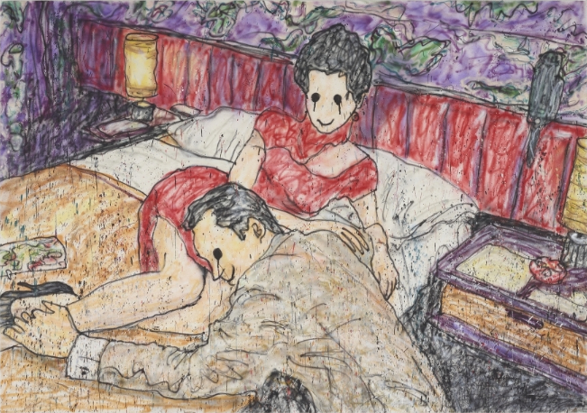 同時他的畫更有著獨特的個人化風格,尤其纖細扭曲的線條和皺巴巴的色彩,面面俱到的描繪,像是畫者借用他者的形象用干澀的嗓音斷續地向觀眾講述自己經歷的故事,給觀眾一種感傷和懷舊的感覺。這份清冷、敏感、內斂的氣質和稚拙的天真感也讓人聯想到同樣身處東西方文化夾縫中的20世紀初的日裔旅法畫家藤田嗣治。