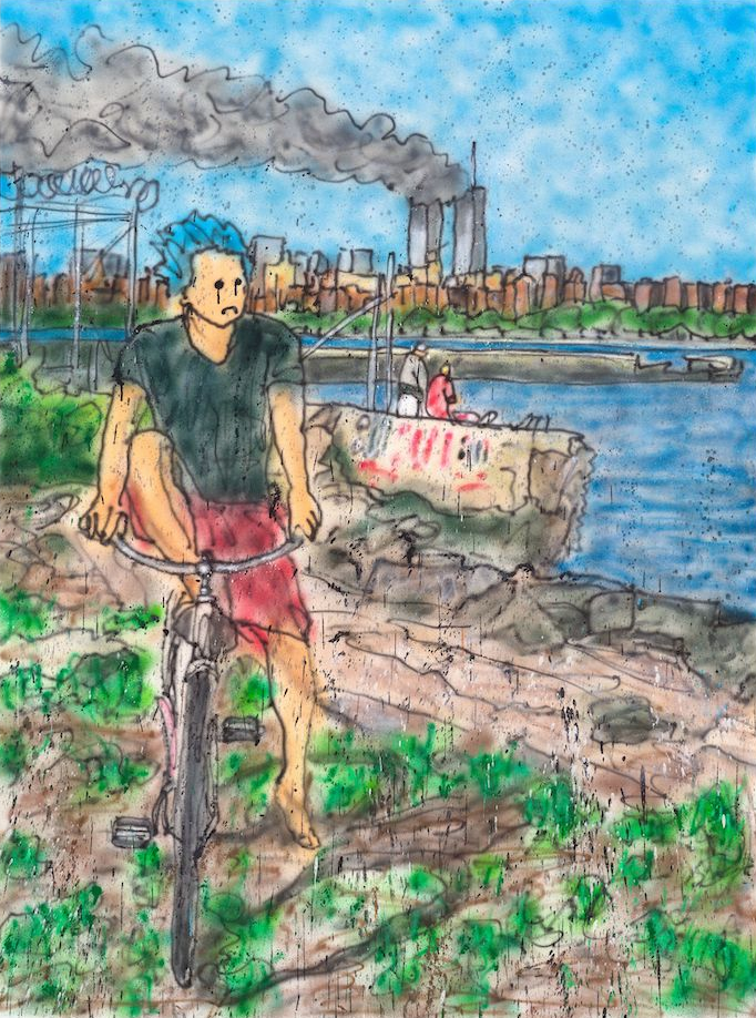 在美國,他覺得哪怕早上披薩店里都充滿活力,但在洛杉磯、紐約或夏威夷沒有靈感讓他想畫畫,這些地方“你可以向任何方向扔石頭并擊中藝術家,所以會有很多競爭和噪音?!彼氐綎|京,這里很難引起人注意,會感到很無聊,他會說,“好吧,讓我們畫畫吧?!?日本是唯一讓他想畫畫的國家。在日本,他開始重溫在新澤西和紐約長大的經歷,誠實面對在這些城市生活所經歷的所有痛苦和磨難的記憶。