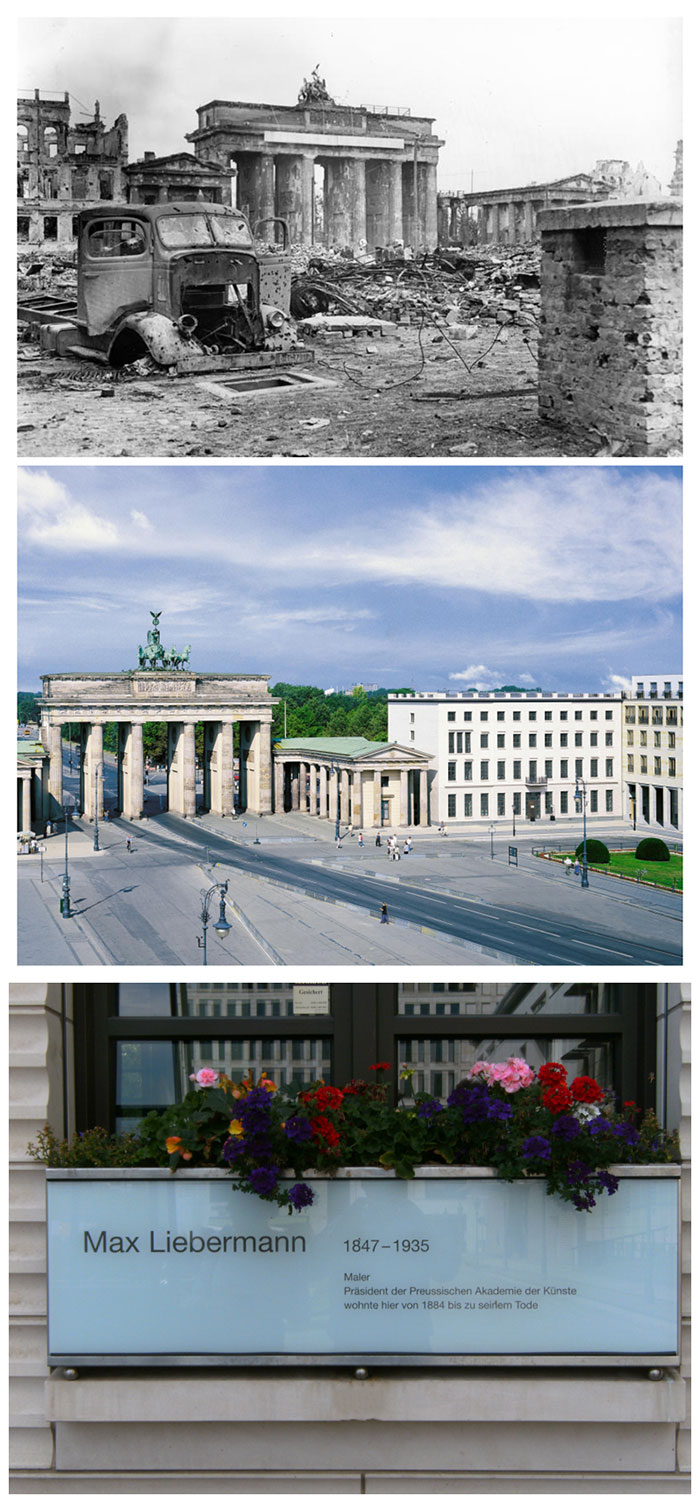 上圖:1945年6月,二戰結束后的勃蘭登堡門以及被炸毀的利伯曼宮;中圖:利伯曼宮修復后的今景;下圖:利伯曼宮上的紀念牌匾 ?Wikipedia