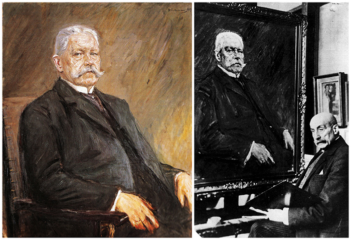 左圖:“興登堡(Paul von Hindenburg,1847-1934)肖像”,馬克思·利伯曼,1927,德國什未林美術館館藏(Staatliches Museum Schwerin);右圖:馬克思·利伯曼在興登堡的肖像前,1927?Wikipedia