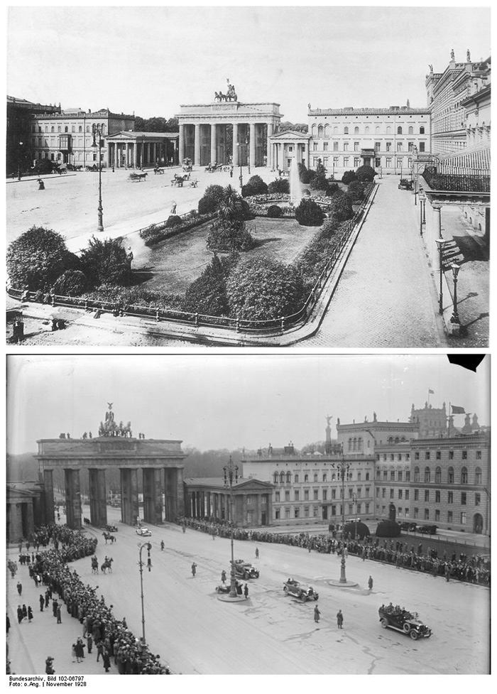 柏林巴黎廣場上的勃蘭登堡門和右側的“利伯曼宮”,上圖:1892年;下圖:1928年?Wikipedia
