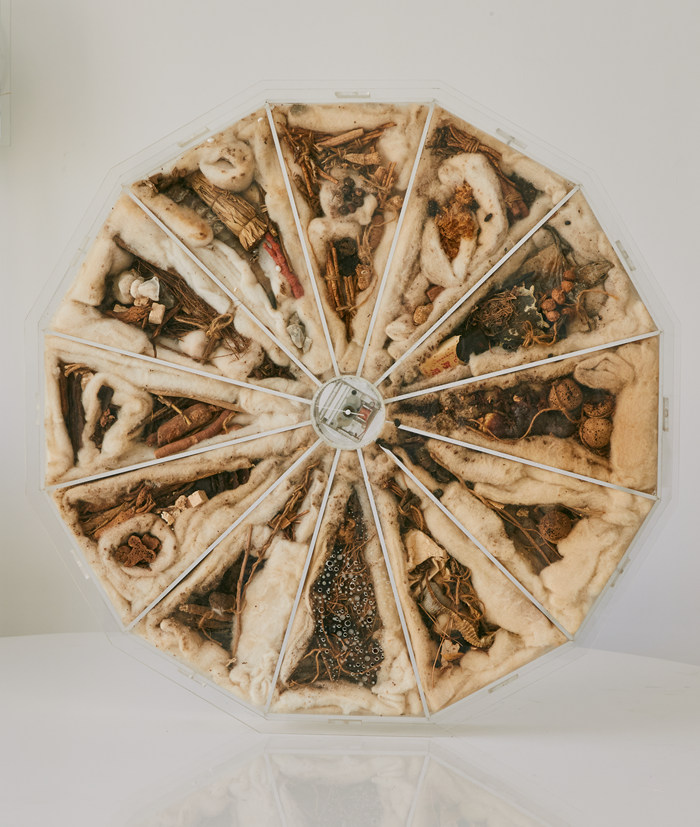 蔡國強-《生命歷No.1》-81×78.5×9cm-中草藥、時鐘、棉花和有機玻璃-1994