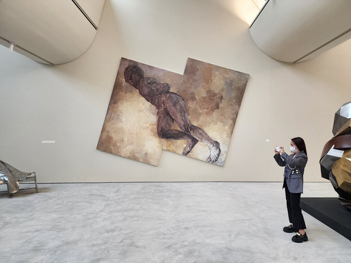 “頌藝術中心”選址于北京藝術核心區——798藝術區最黃金的位置,毗鄰木木美術館、當代唐人藝術中心和馬刺畫廊??臻g選擇在北京市文物保護建筑——1950年代德國援建的包豪斯風格建筑樓體,由國際知名建筑師事務所Temp的主理人,也是AD100建筑師獲獎人——Howard Jiho Kim操刀設計,他秉持“頌藝術中心”創始人兼館長蘇芒女士提出“現代且典雅”的美學調性,打造出了具有神圣感的藝術殿堂空間。