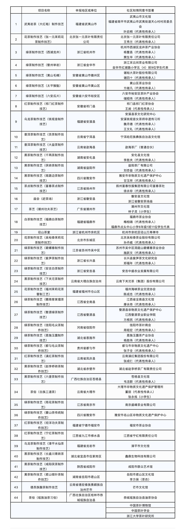 “中國傳統制茶技藝及其相關習俗”相關44個項目列表