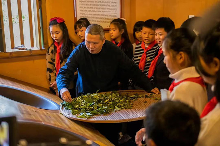 代表性傳承人劉安興正在給小學生示范“武夷巖茶”的制作技藝(作者:肖文鳳)