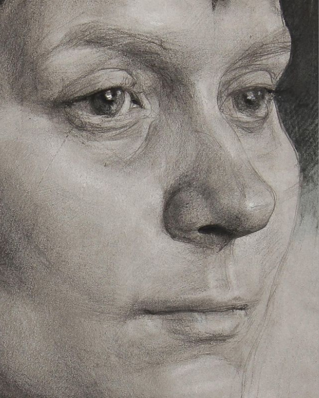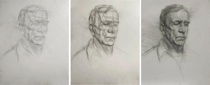 首先起稿畫出人物臉部結構;其次在確保結構、透視的精準之下,區分出人物臉部的黑白灰關系;然后從整體到局部,不要著急去刻畫人物臉部細節,只需要用擦筆擦出人物臉部的黑白灰關系即可。