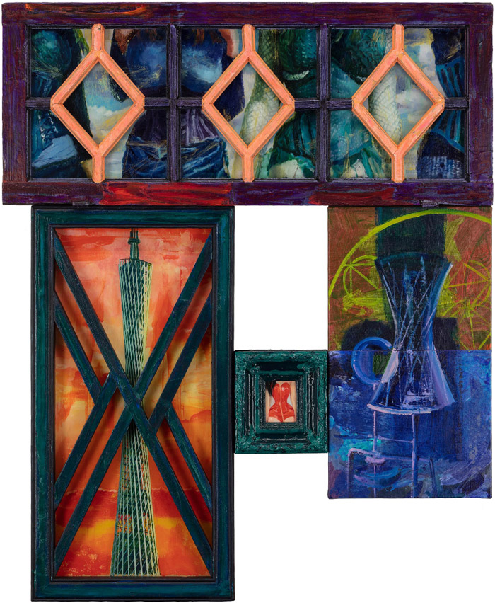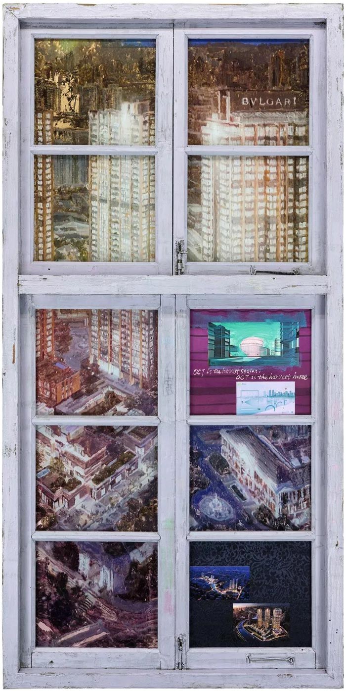 迷窗·華僑城,木、金屬、有機玻璃、油彩、馬克筆、衣物、印刷品、鋁塑板,212.5×106×10cm 2019