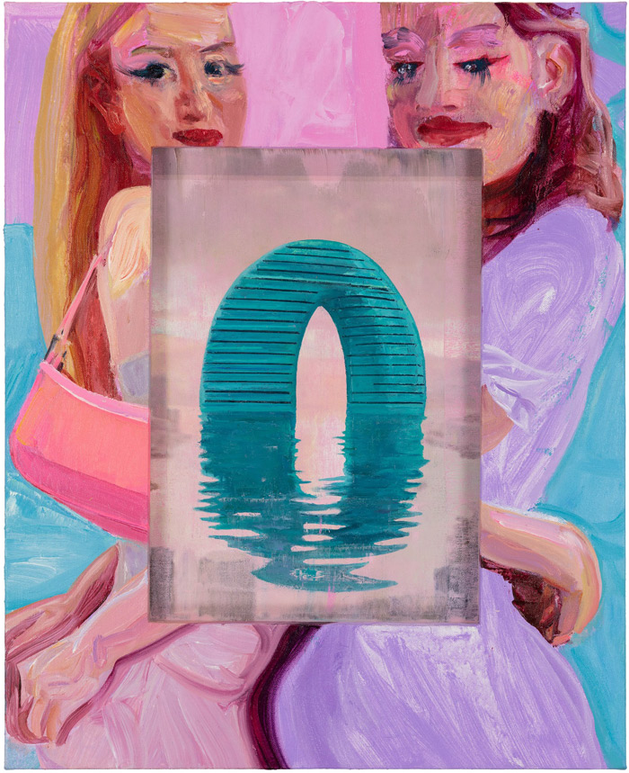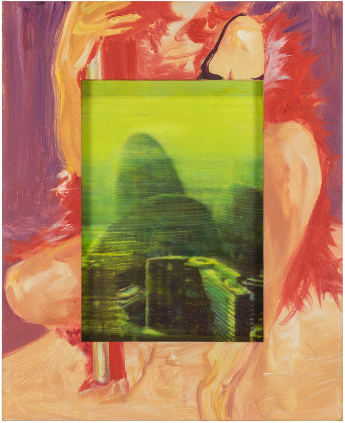 李青的作品無疑具有很強的觀念性,但對普通觀眾來講,李青作品中大量的城市有趣的形象和調侃的味道具有很大的可讀性和觀看欲望,藝術家經常設置各種話題和視覺符號,吸引觀眾目光,不僅他早期的“找茬”“互毀”,觀眾需要在兩幅畫面中視線不斷游移,快速辨別微小差異。在窗系列里,窗框后面的畫面有的完整,有的則是不同分窗畫面,相互間聯系若隱若現,碎片化的視覺信息,觀眾可以品味出更多的細節。最新的框形畫描繪了都市艷俗的人物形象與網紅建筑與抽象符號,讓上下兩幅畫產生直接的遮蔽和覆蓋的關系,這種方式看似突兀,但似乎更像是社交媒體時代中人對屏幕畫面快速瀏覽方式的戲仿,圖像與圖像之間構成了直接的介入與聯絡,在似有似無中,觀眾會對畫面產生更多的有趣的聯想。