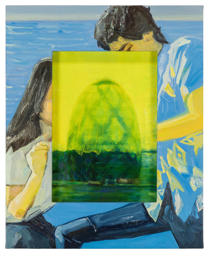 李青:新展是我近一年的新作,基本就是兩個系列,一個是窗系列,另一個是框形畫。窗系列已經延續十年了??蛐萎嫳容^新,2017年,我就嘗試在一個框形上作畫,去年至今就集中做了十來件框形畫,框形畫和之前的窗系列有延續性,就是把“窗”抽象為更簡約的一個框形??蛐伪旧磉€是回到了繪畫,框形畫中間部分是空的,它被另一張畫所填充,有一個窗口的結構,兩個系列是密切相關的,展覽線索比較統一。展覽的題目叫“框形”,它也是很直接、很去魅的一個題目,框形是作品的一個基本結構,我以前很多作品都和框形有關系嘛,框形是界定了觀看的范圍、觀看的方式,或者本身就是我看世界的界面、我工作的界面。有兩件作品是畫框和窗框融在一起的形式,它既有窗的元素也有框的元素,更接近于繪畫的拼貼模式吧。