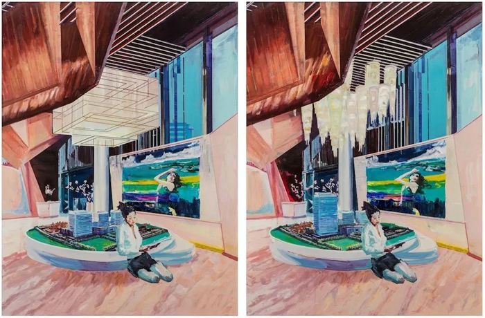 《大家來找茬·樓姐》(兩圖有五處不同),布面油畫,200×150cm×2,2019