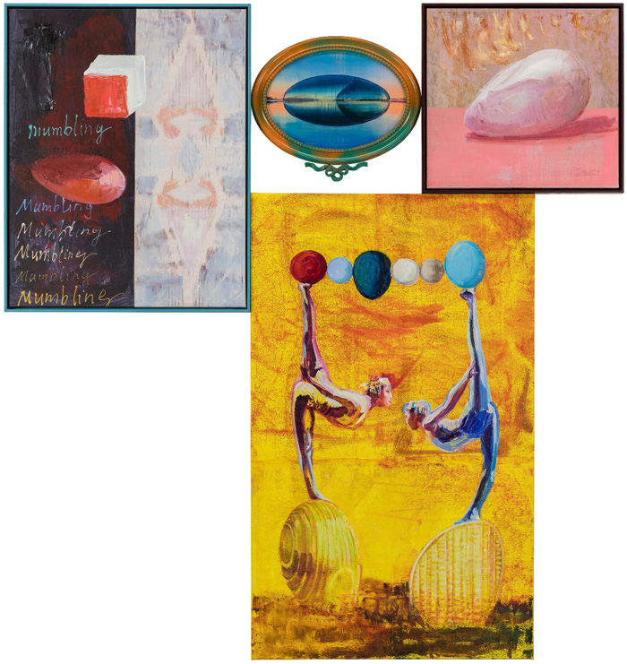 呢喃的蛋形 Mumbling Ovals 油彩、丙烯、油漆筆、亞麻布、木板、畫框 oil paint, acrylic, paint markers, canvas, board, frames 150.5X142X6cm 2019.9-2022.7