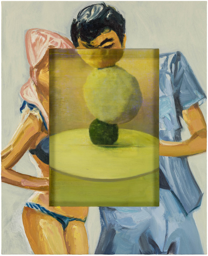 李青:結構本身會帶來繪畫新的體驗,原來的繪畫是在一個完整的畫布上進行,它需要考慮在一個四方形畫布里的結構性,它還要考慮到中心和四邊的關系,但是框形畫打破了中心和四邊的關系,它把中心抽空了,中心也成了一個框,有了內在的四個邊,對我來講這更有趣,它刷新了我繪畫的一個經驗,我就要考慮外面那幅鏤空的畫和中間畫面的結構關系,外面那幅畫,我畫的大多是帶有一點表演性的人物,他們的姿態和動作,人和人之間的關系比較浮夸,有一點矯揉造作,畫的中心部分是一個虛空的圖層,觀眾可以去想象腦補出來,這種顯現和遮蔽的關系其實很值得玩味,中間空缺的部分像弦外之音一樣,可以被人所感知。