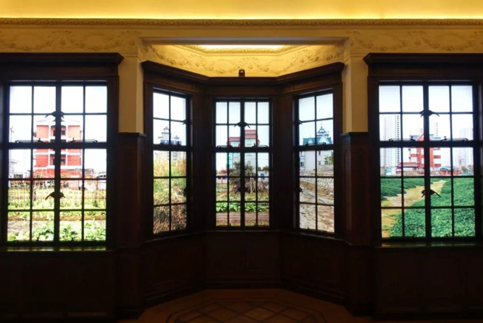所以我其實在討論城市當中人和建筑的關系所改變的歷史和當下的狀態。我做了一些作品也是和榮宅過去的歷史有關的,包括過去主人的肖像,肖像之間的“互毀”,包括過去房間里面也會擺上比較私密的東西,比如床,卡拉OK廳,在私密和公共體驗里面不斷交替地出現。展覽里面也討論了很多和家和建筑有關的議題,比如我拍的杭州自建房就出現在榮宅的窗子上面,似乎是通過榮宅的窗子看到了那些建筑,其實那些都是家,但屬于不同的時代、不同階層的人群,一個是上海灘真正的豪宅,一個是杭州郊區農民想象中的豪宅。他們之間的對望就比較戲劇化。一樓的八個窗子畫的都是上海的建筑,有老的建筑——琥珀大樓、安培洋行,這些老建筑有些被國外大畫廊改造為藝術空間,包括我現在的新展就是在琥珀大樓,現在里面入駐了三家國際畫廊,安培洋行有佳士得拍賣行的空間,榮宅是Prada的空間,然后也畫了K11、華僑城、上海展覽中心等幾個新的建筑,今天新的資本也在參與文化建設,所以這些上海的老的、新的建筑,都是和當代藝術有關。